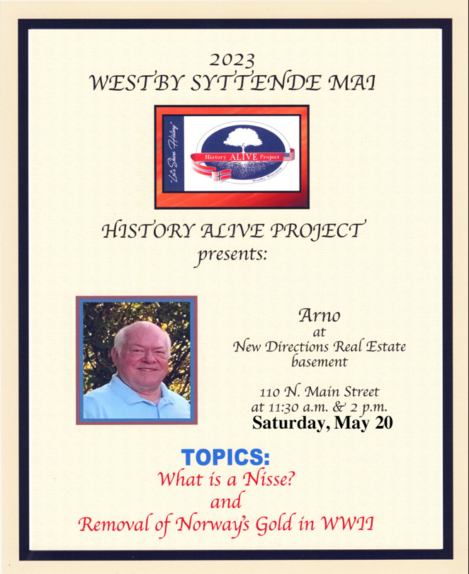 The History Alive Project will have a few presentations during the day that will be held in the basement of our office building. At 11:30am Arno Morton will be speaking on a variety of topics including the difference between Nisse and Trolls. During his presentation at 2pm, he will also bring to life the stories of Norwegian WWII bravery to get the gold and the king out of Norway so that the invading Germans would not capture.