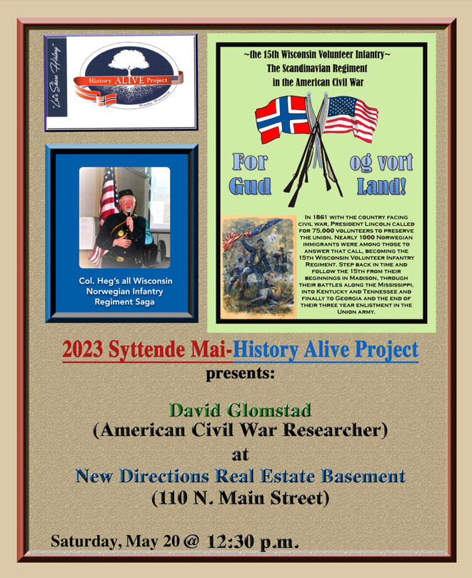 At 12:30pm the History Alive Project presents David Glomstad, American Civil War Researcher. He will appear in a Civil War uniform and explain his authentic Civil War firearm. Nearly 1,000 Norwegian immigrants were among those who answered the call to help fight and became the 15th Wisconsin Volunteer Infantry Regiment. Mr. Glomstad will take you from their beginnings in Madison through their battles along the Mississippi, into Kentucky and Tennessee, then finally to Georgia and the end of their three year enlistment in the Union Army.