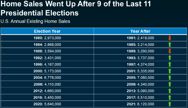 We’ve observed this cycle in every election year since 1992; people hesitate due to an uncertain economic forecast and not knowing what will happen with economic policies that affect housing in the next season. That “pause” causes a plateau in the market that compresses the supply and demand for a short time going into the fall and through winter. As you’ll see in real numbers in the chart below, after the political climate settles and consumers feel better about what to expect for the next four years, the year following an election has proven to increase the number of home sales significantly in 9 of the last 11 election cycles…including the last 8 in a row dating back to 1993!